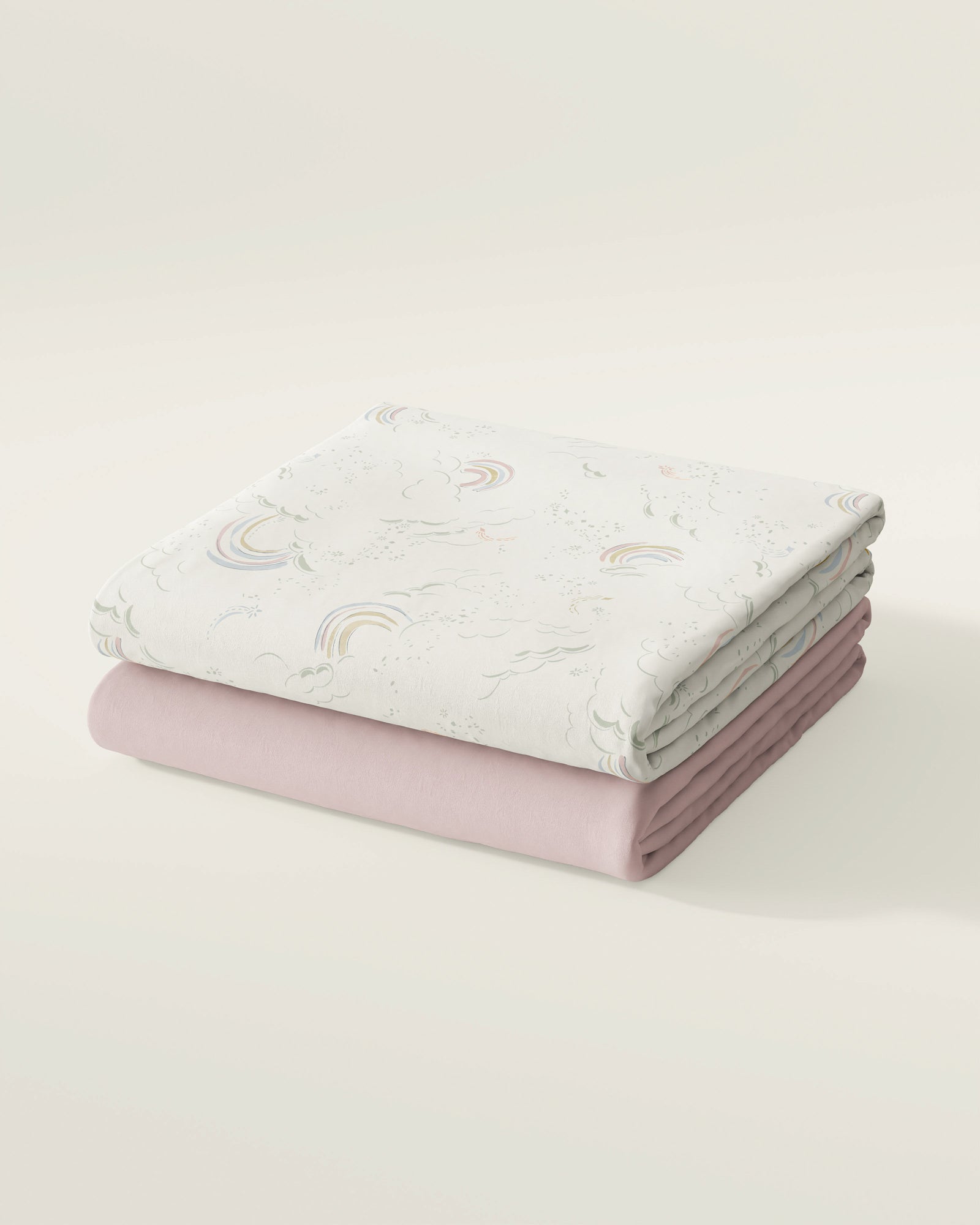This set of two GOTS-certified organic cotton fitted sheets features one in our rainbow-inspired print and one in solid Shell. Each set is handmade in Brazil by local artisans using OEKO-TEX certified, non-toxic, all-natural dyes.